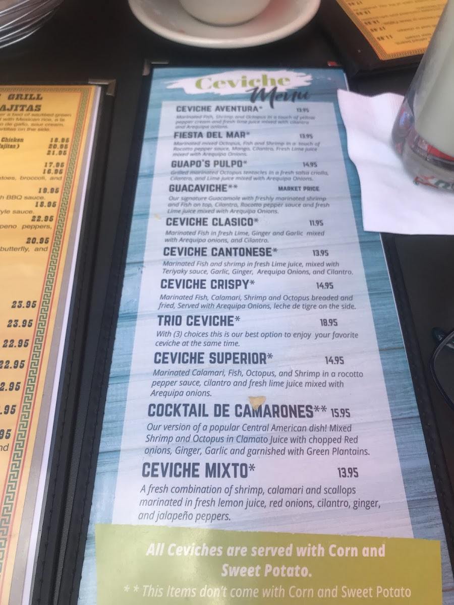 Fish, Calamari, Shrimp, and Octopus, marinated in Leche de Tigre, breaded and fried, served with Arequipa onions.